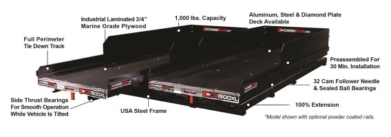 1500 lb capacity. 100 percent of the Cargo Tray Length Slides Out for Total Access to your Cargo. Real plywood deck with a TPO rubber laminated surface for strength and durability. 36 Industrial Cam Follower Needle and Ball Bearings provide Dependable Lasting support for the Cargo You Haul in Your CargoGlide. Powder Coated Industrial 4 in. high extruded 6061-T6 Thick Aluminum Side Rails with integrated Full Perimeter Tie-Down Tracks and 4 Infinitely Adjustable Eyebolt Tie-Downs to make securing cargo easy and versatile.Includes 8 in. High Side Extensions on the first four feet of the rails at the cab end, helps contain more cargo. The outside dimensions for this unit are 75 in. long and 49.25 in. wide. The inside deck surface is 74 in. long and 48 in. wide. Total Deck Height is 6.25 in. Comes fully assembled for easy installation by either 2 people or an available National Dealer Installer. Fits 1970-2017 Chev/GMC Silverado/Sierra Shortbed 6.5 Ft Bed, 1970 1970-2017 Ford Shortbed 6.5 Ft Bed All Cab Designs, 1970-2017 Dodge Ram 1500/2500/3500 Shortbed without Bedliner, 2007-2017 Toyota Tundra Reg Cab/Dbl/CrewMax Cab Shortbed, 2004-2017 Nissan Titan King Cab Shortbed 6.5 Ft.